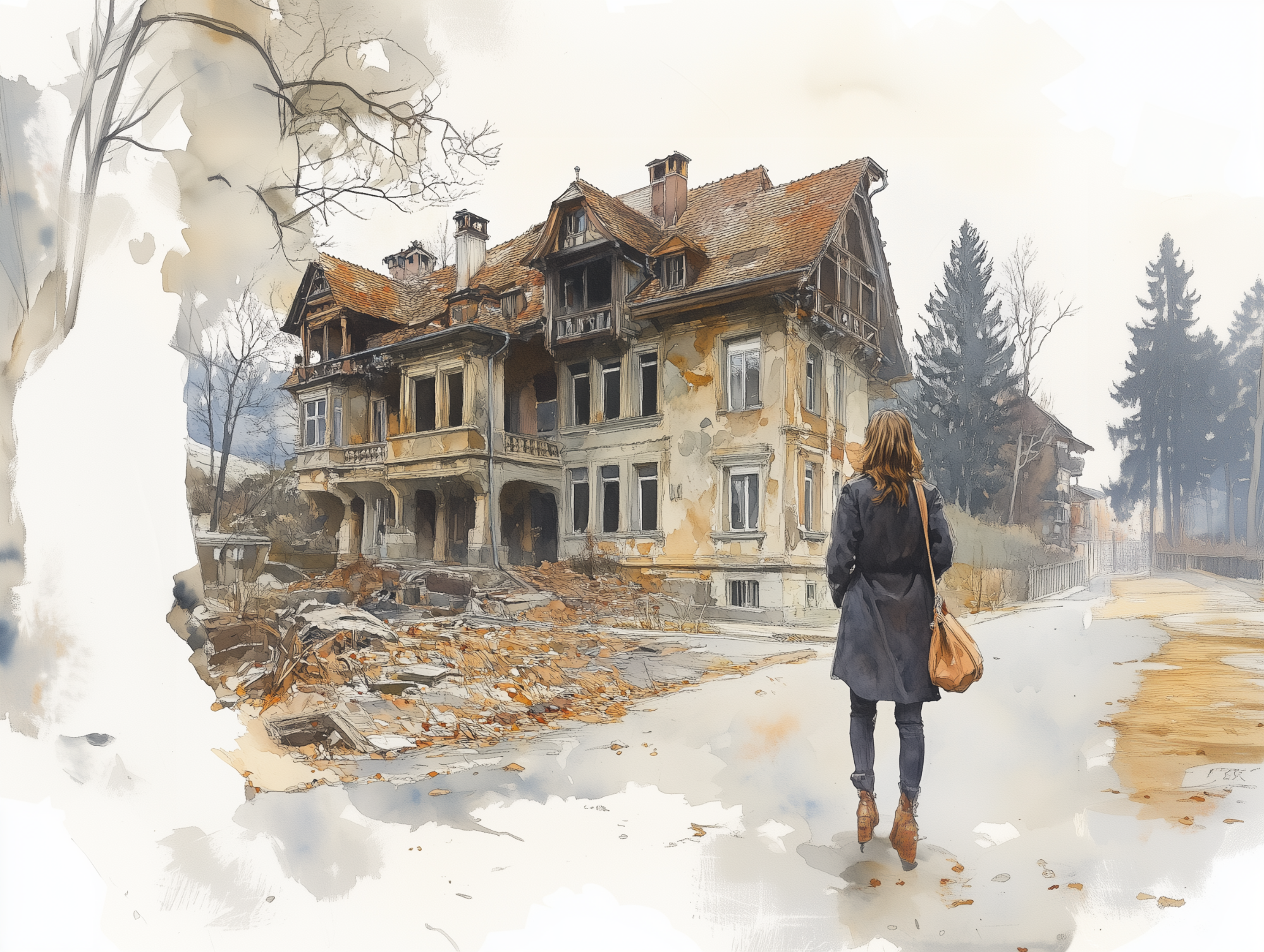 Die Antwältin vor dem heruntergekommenes Haus (KI)