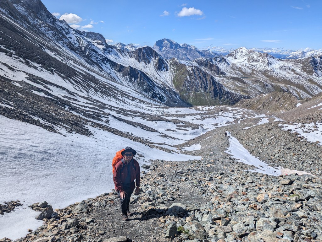 On our last day, instead of walking down from the hut to the train station, we did a return trip up to close to Fuorcla d’Es-cha. It’s officially a blue trail but I think only if you do the pass, which some crazy people did! It was not advisable, again because of snow on the pass. We walked very close to it until we didn’t see any reasonable path to continue on. Either because it’s a blue trail or a weekday, not many people were there. In fact, we only heard voices from the pass but didn’t really see them. The terrain up there is rocky and the view down is amazing on a sunny weather.