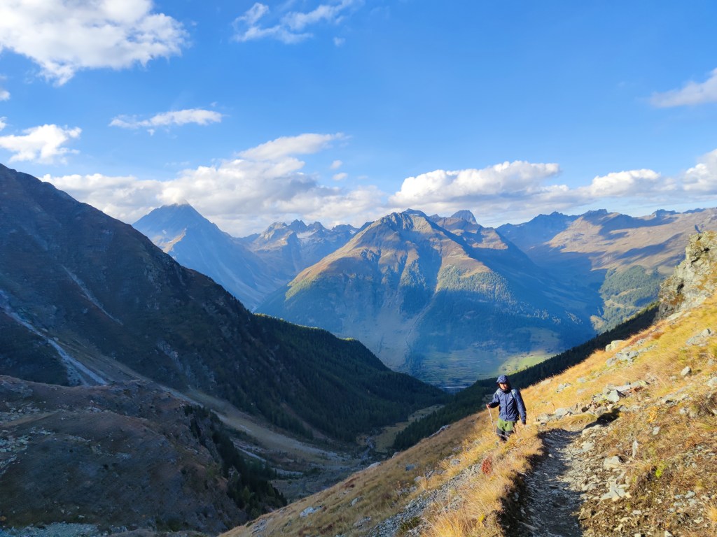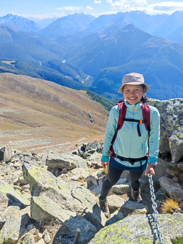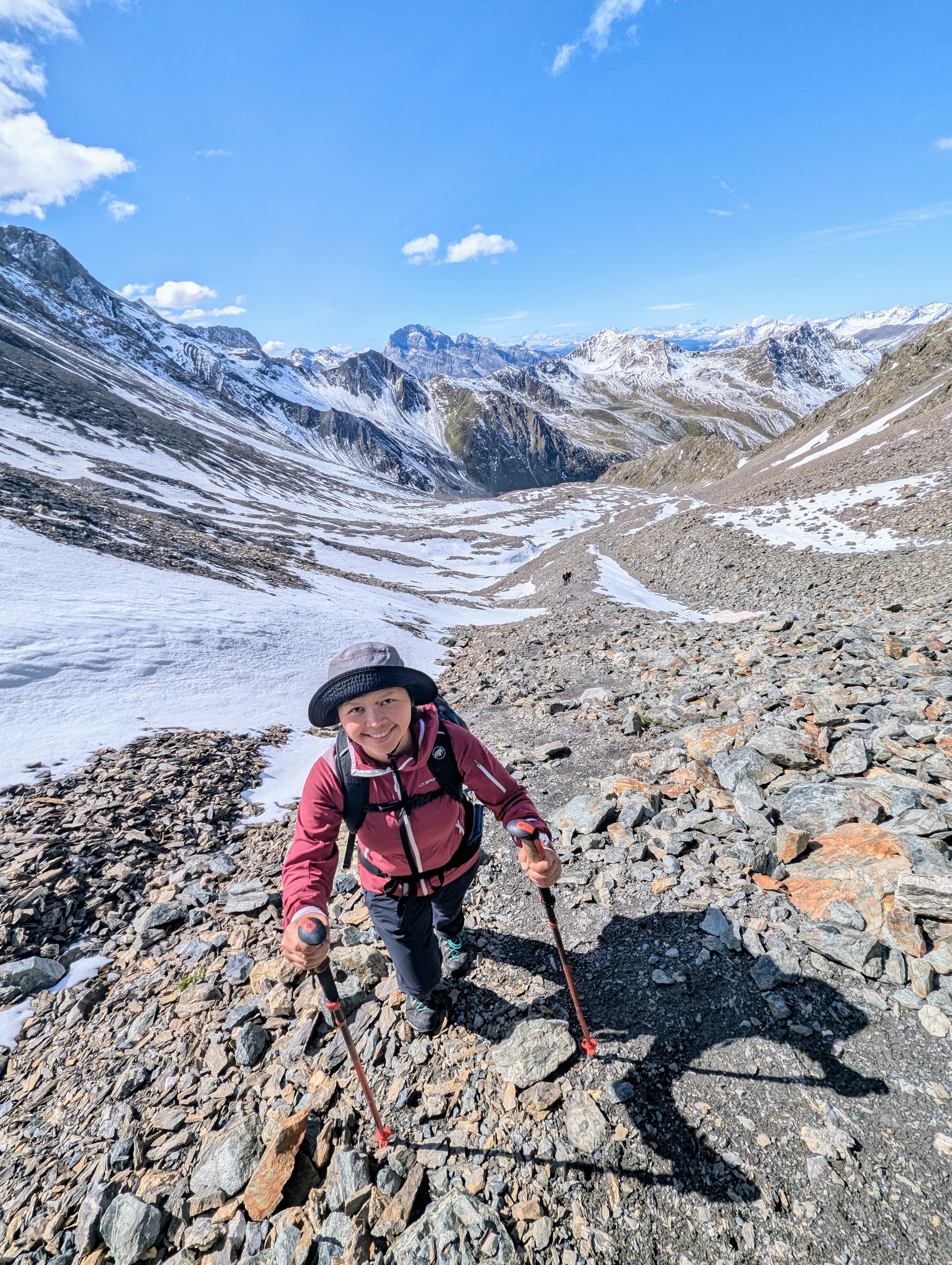 The toughest part of the trip for me was the uphill climb to Fuorcla Pischa. It was steep up and rocky, but I didn’t feel it was dangerous. It’s really more that you have to have the stamina to continue walking until you reach the windy pass. The view from there is definitely worth the effort. Otherwise, the rest of the trail was relatively easy and enjoyable although I should mention that whenever there’s an option to walk on a valley or a single-lane-path carved on the side of a mountain, we consciously chose the less exciting but much safer valley walk.